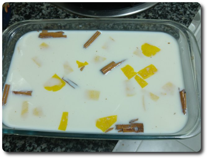 1. Metemos en la nevera por 24 h. 750 ml. De leche junto con la monda de medio limón grande troceada sin lo blanco y dos ramas de canela.