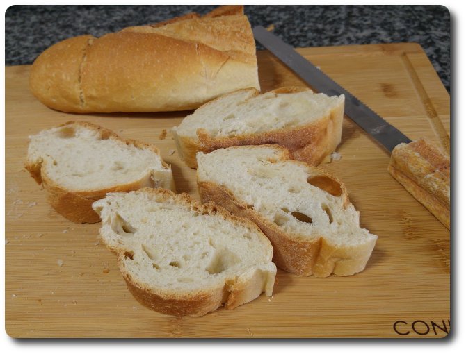 Vamos cortando rebanadas de pan de nuestra barra, de unos 2 cm. Puede emplearse tanto pan del día anterior, o de un par de días como el del mismo día. Tan solo debemos tener en cuenta que si empleamos pan del mismo día, tenemos que remojarlo menos, pues sino se nos puede partir al ablandar por la acción de la leche.
