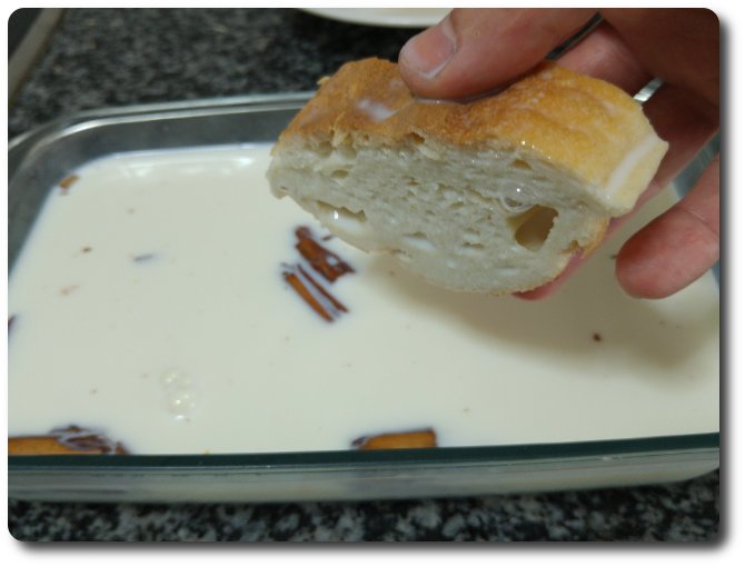 Vamos empapando nuestras rebanadas de pan en leche. Cuanto más secas estén, más capaces serán de absorber leche. Un truco podría ser el calentar en horno a baja temperatura el pan antes de empaparlo en la leche. También ayuda el apretar un poco las rebanadas a modo de esponja facilitando que absorba más leche.