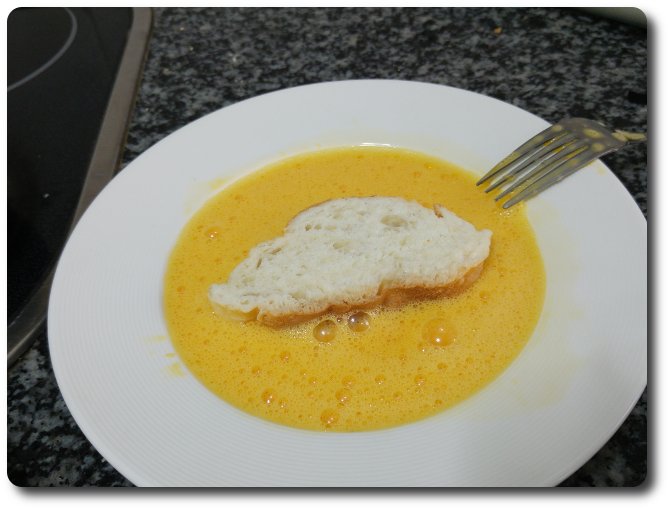 Una vez bien mojadas nuestras rebanadas de pan, las escurrimos un poco y las sacamos.