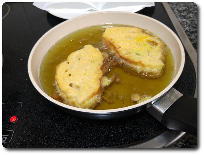 6. Calentamos suficiente aceite en una sartén no muy grande para dos torrijas.