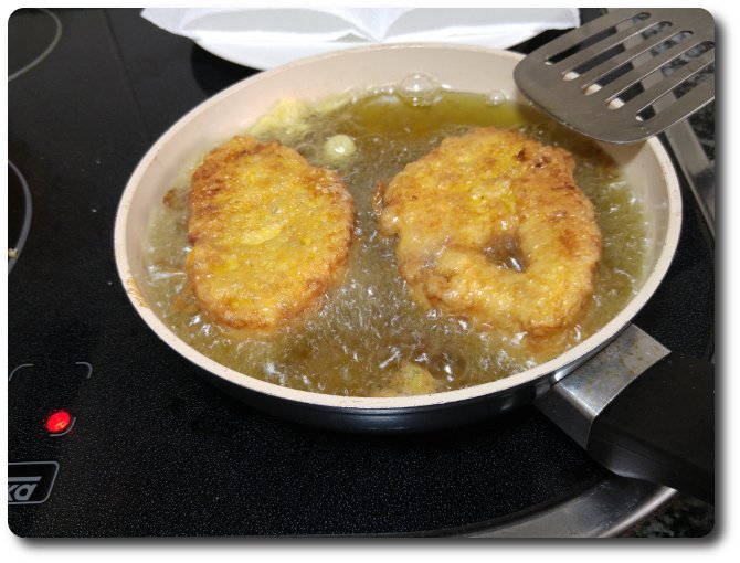 9. Las escurrimos un poco y las freímos de 2 en 2 en aceite a unos 170-180º C
