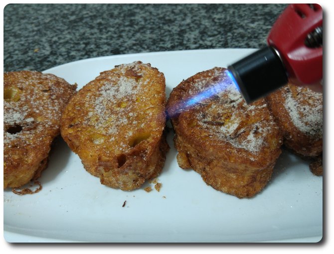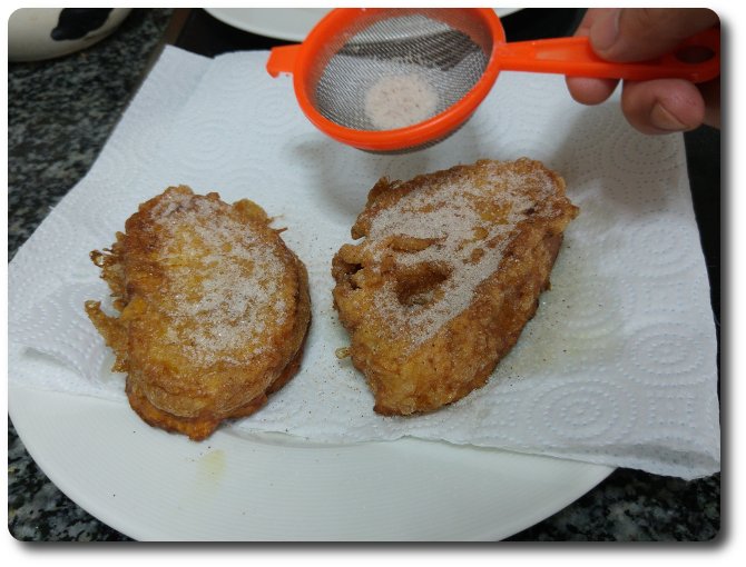 En ese momento, con la torrija todavía húmeda y caliente, espolvoreamos por encima nuestra mezcla de azúcar y canela. Un colador pequeño nos facilita la tarea.